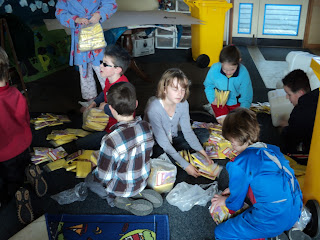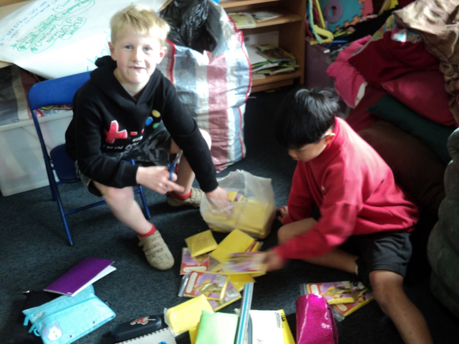 Still dividing the rain ponchos into 4 piles for the bins..............